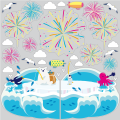 真ん中で分割するタイプのシールなので、自動ドアにおすすめです。ビビッドなカラーの花火が豪華に打ち上がり、氷島で釣りを楽しむ生き物に癒されてください。