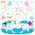 ビビッドなカラーの花火に氷島で釣りを楽しむシロクマたち。賑やかで楽しい壁用デコレーションシールです。待合室やキッズスペースなどの壁におすすめです。