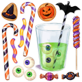 「トリック・オア・トリート!」目玉入りジュースにクッキー、キャンディなどハロウィンスイーツの壁用デコレーションシールです。
